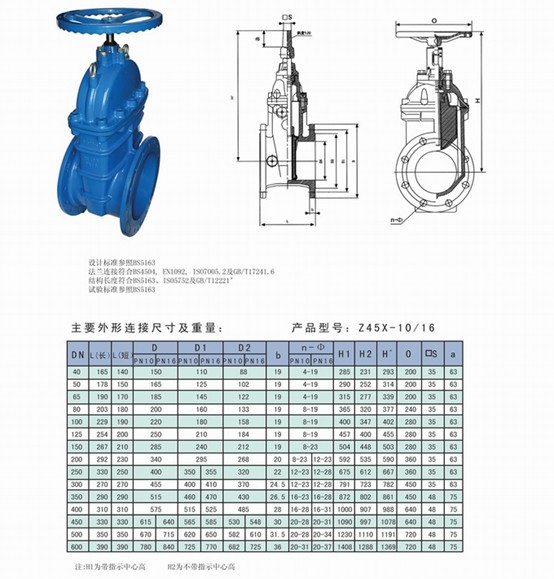 (1)电动机传动、法兰连接、明杆楔式双闸板、阀座密封面材料由阀体直接加工,公称压力0.1MPa,阀体材料为灰铸铁的闸阀,示例如Z942W-1为电动楔式双闸板闸阀。
