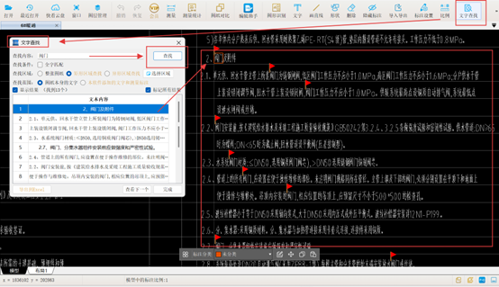 2. 为精准计量阀门工程量,计算前须查阅设计说明。首先运用CAD快速看图软件的【文字查找】功能,输入关键词并设定搜索范围,即可精确定位相关设计说明内容。随后,通过【提取文字】功能,可将关键说明信息直接复制至计算表格。