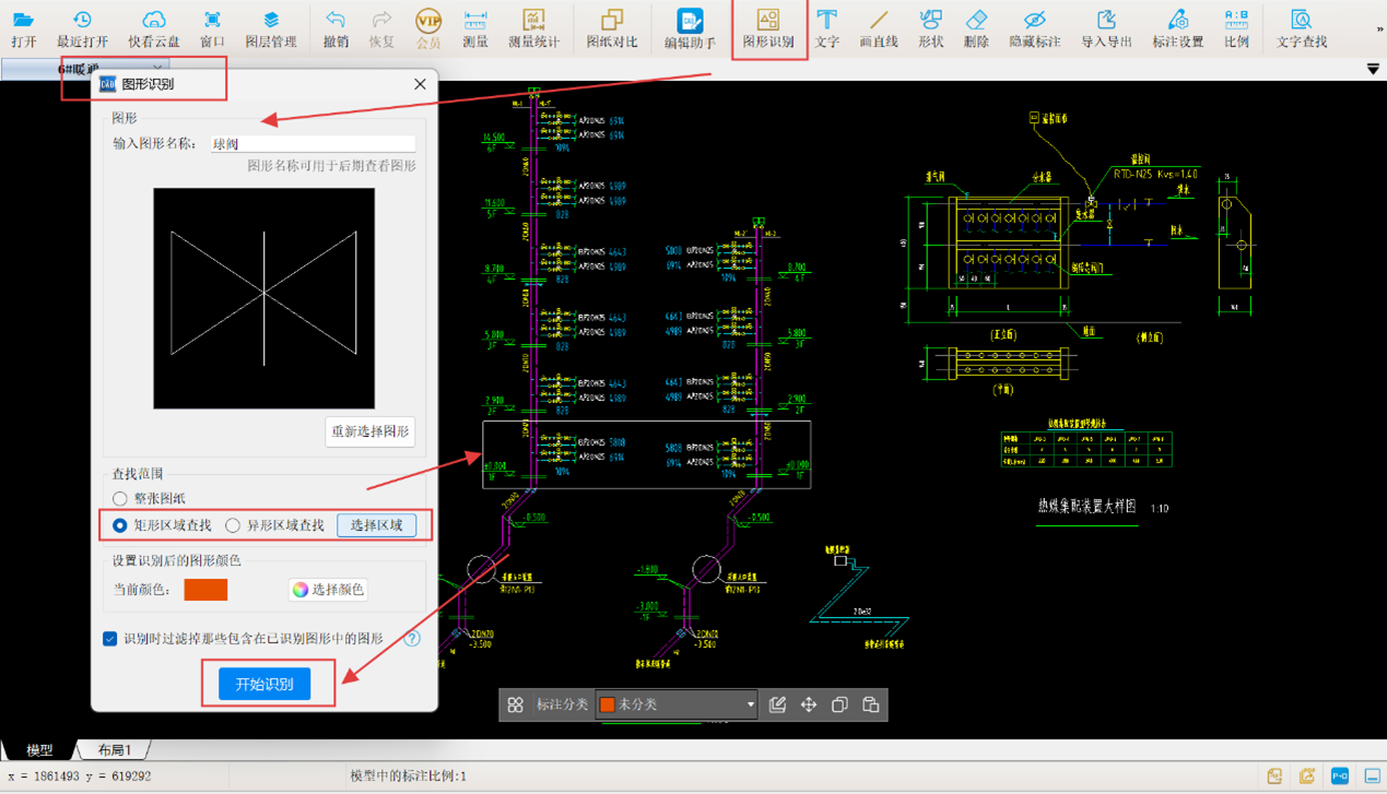 在设备与工业管道系统中,常见阀门类型涵盖闸阀、截止阀、节流阀、球阀、蝶阀、隔膜阀、止回阀等。【图形识别】可高效完成工程量计算,其强大的图形识别功能仅需框选图纸区域,即可自动识别阀门并输出工程量。