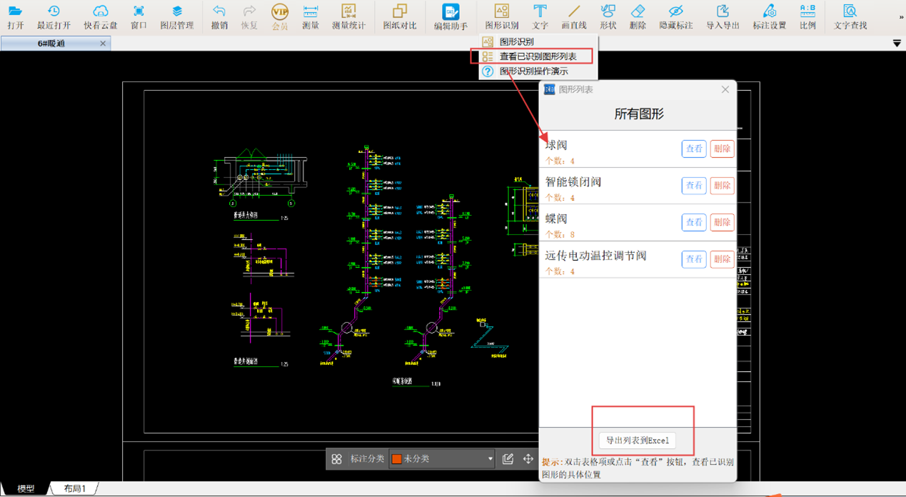 完成所有阀门识别后,通过【查看已识别图形列表】功能统一统计阀门工程量。如图所示,远传电动温控调节阀4个、蝶阀8个、智能锁闭阀4个、球阀4个,还可以将工程量导出到Excel表格。