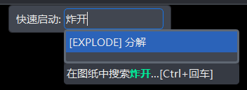 方式一:快速启动栏。通过键盘在快速启动栏中输入指令来执行命令。快速启动栏全面支持中文命令输入,同时也兼容传统的英文命令以及快捷键,鸿鹄CAD的所有命令都可以在快速启动栏中实现。此外,鸿鹄CAD还支持中文命令模糊搜索,例如,当您在快速启动栏输入“炸开”或“打散”时,系统会通过模糊搜索匹配到对应的标准命令“分解”,如图1-30所示。