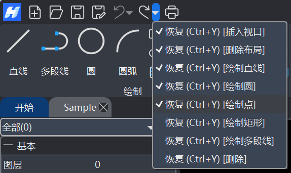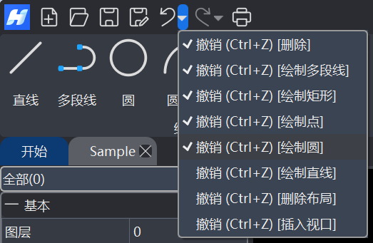为提高绘图的灵活性与容错能力,鸿鹄CAD提供了"撤销"与"恢复"两个基本纠错命令。"撤销"命令用于按时间倒序取消一个或多个操作,让图形恢复到上一步或更早的状态。“恢复”仅在执行"撤销"操作后可用,作用是还原上一步或更早执行的"撤销"操作,图形回到被撤销之前的状态。
