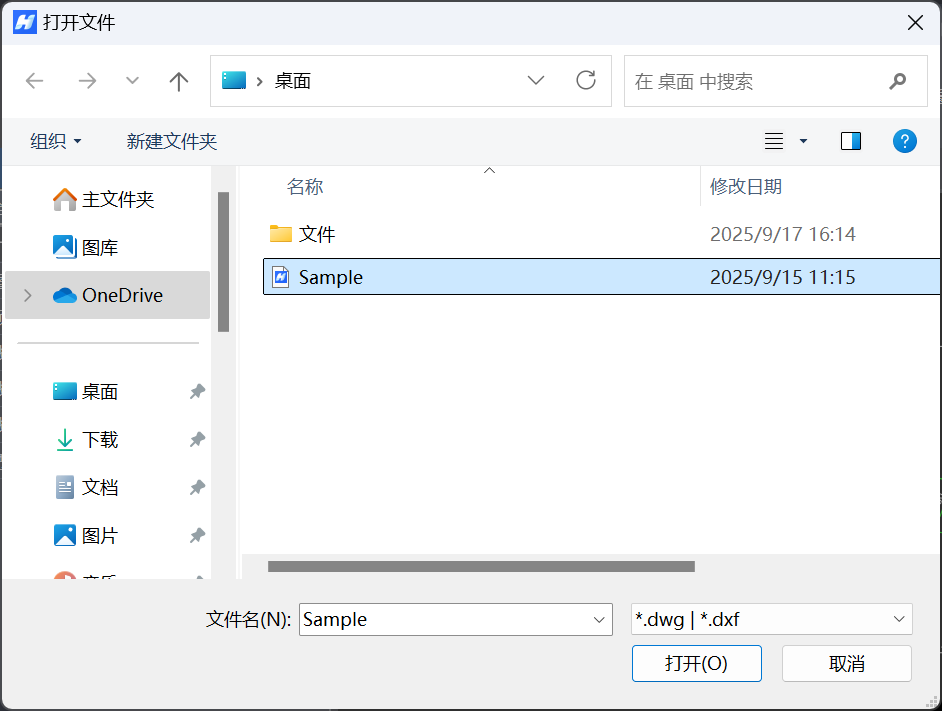 "打开文件"命令用于从您的计算机或网络位置加载一个已存在的图形文件(.dwg/.dxf 格式)进行查看、编辑或打印。
