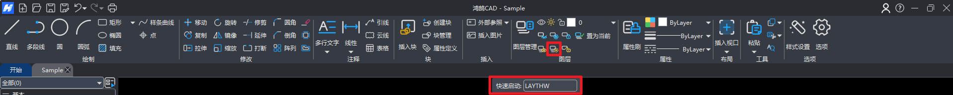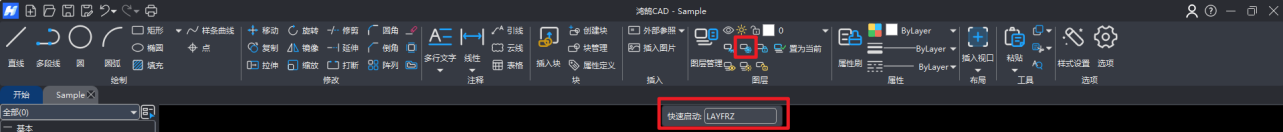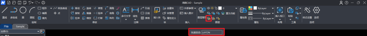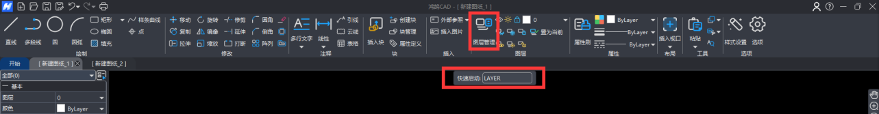 方式二:顶部中间“快速启动”命令区中输入“LAYER”或“图层管理”,如图2-1所示。