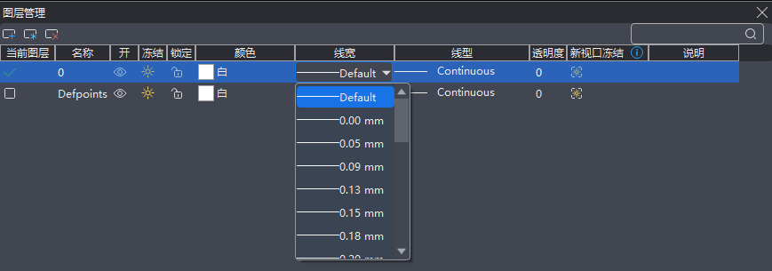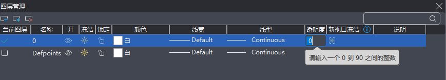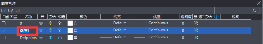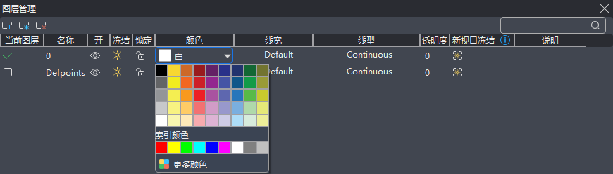 通过“图层管理”功能,您能够新建图层、删除图层、设置当前图层,并配置图层的属性(包括名称、颜色、线宽、线型、透明度)。此外,您还可以控制图层的开启/关闭、解冻/冻结、解锁/锁定。方便对图层进行区分和管理。