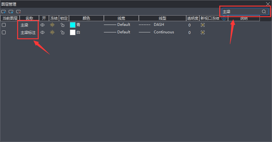 10.当图纸中图层数量较多时,您可以借助右上角的搜索框实现图层的快速查找。输入图层名称后,相应的图层会呈现在“图层管理”窗口中,如图2-9所示。