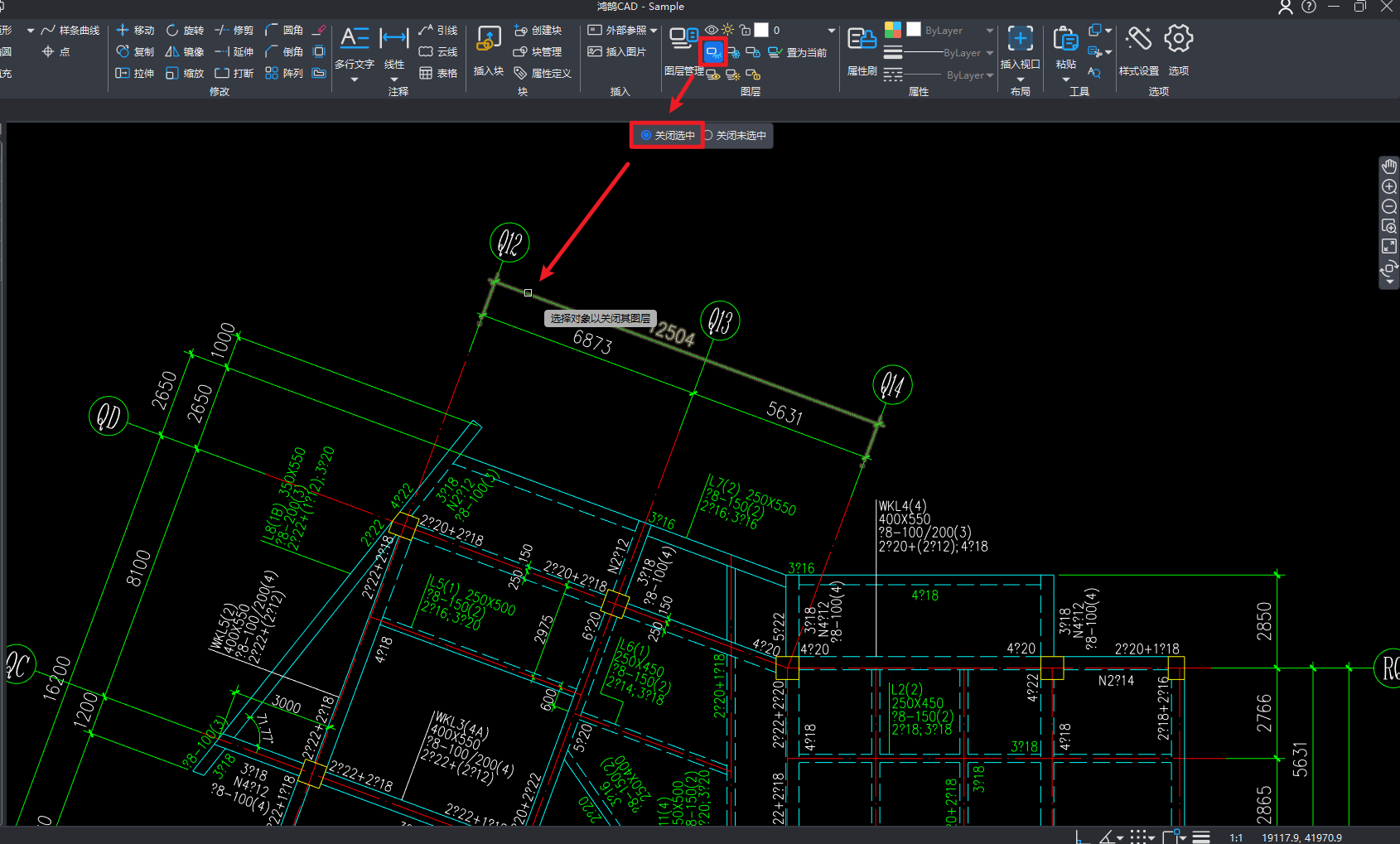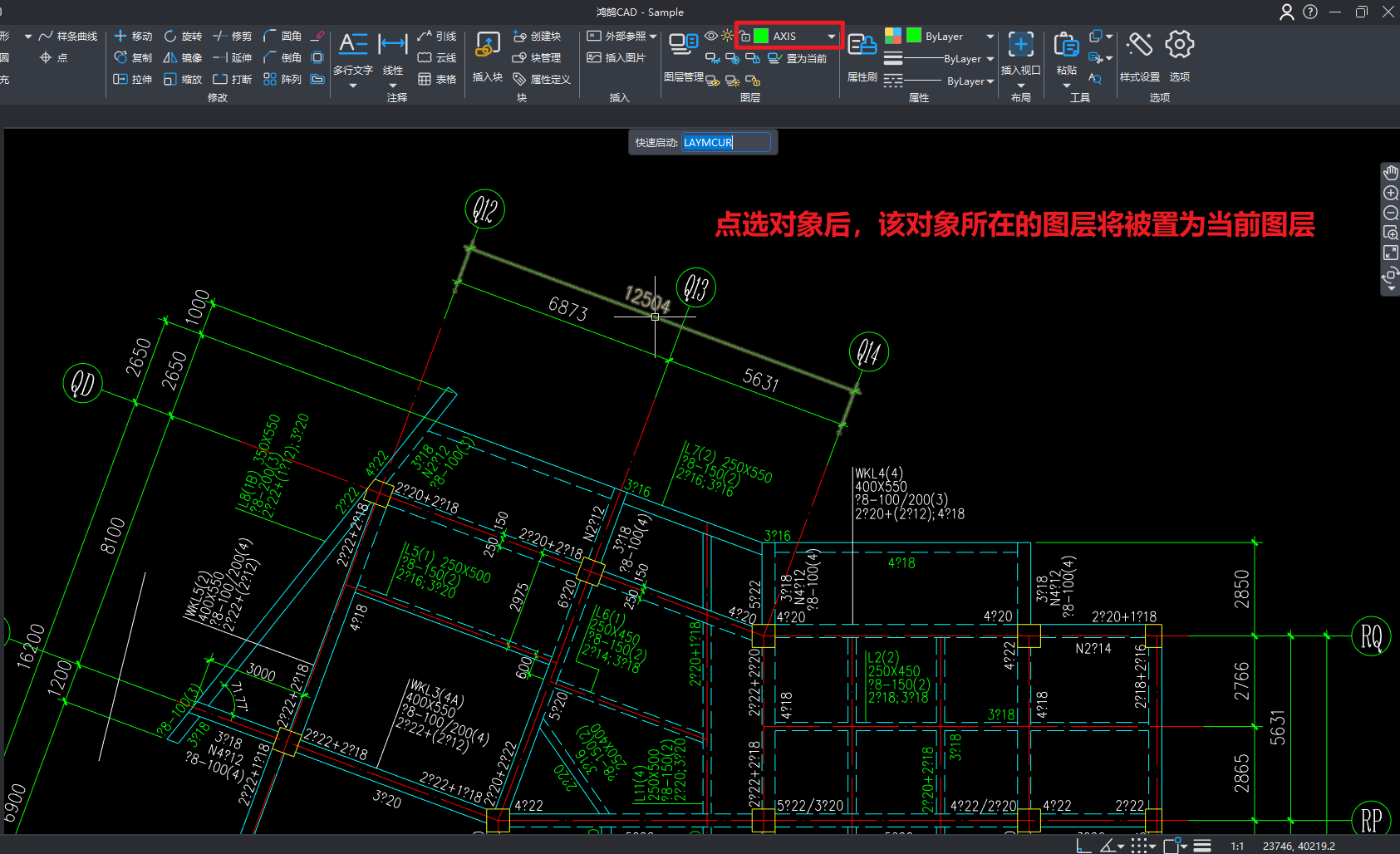 3.选中对象后,“图层”功能区中所展示的图层,即为该对象所属图层。通过此功能,可快速判断对象属于哪个图层。
