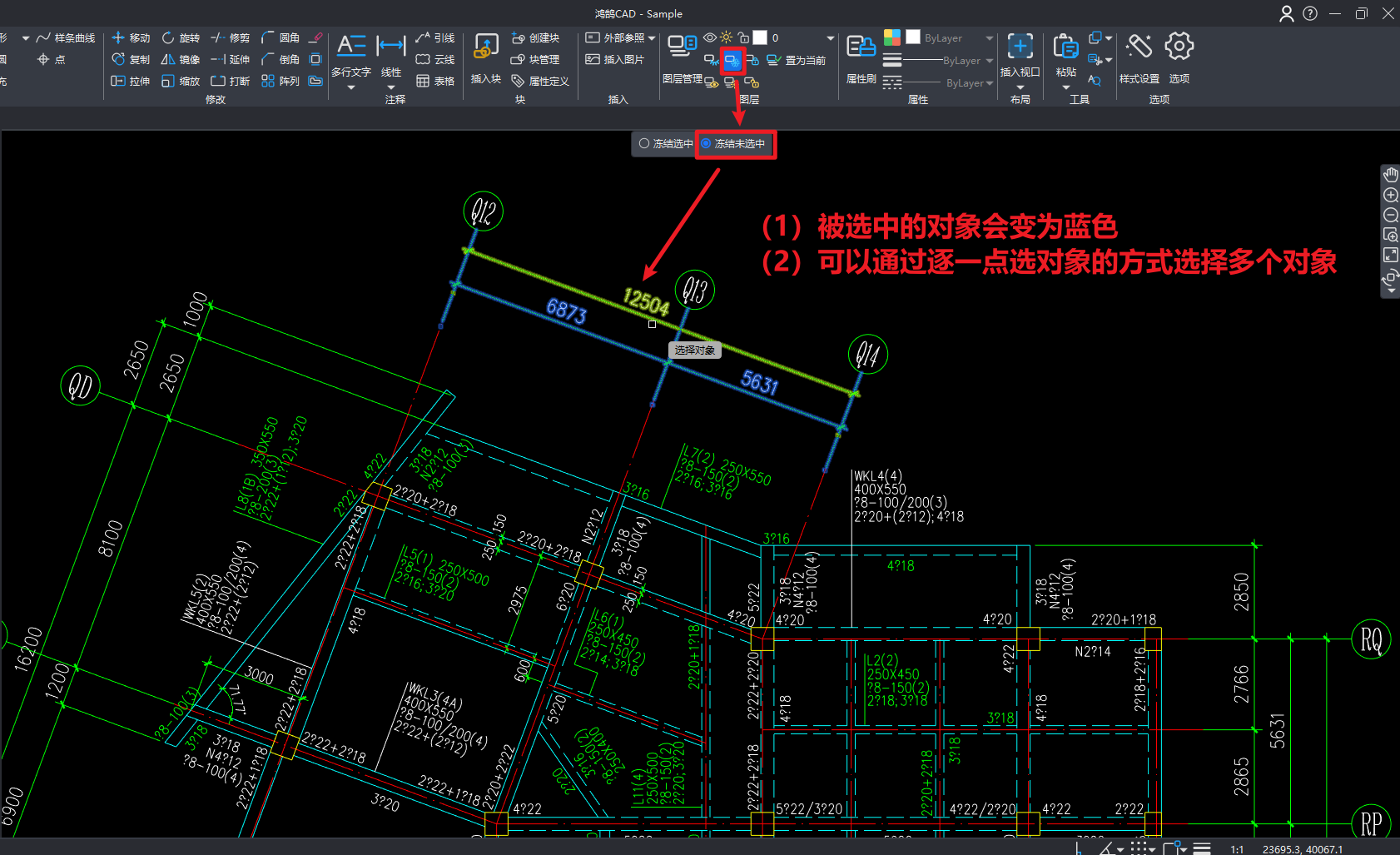(1)“冻结图层”功能只能使用鼠标逐一点选对象,无法拉框选取多个对象。