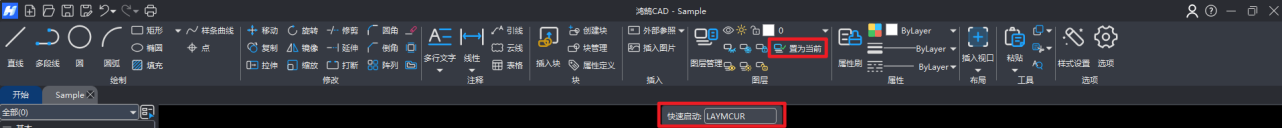 方式二:顶部中间“快速启动”命令区中输入“LAYMCUR”或“置为当前”,如图2-32所示。