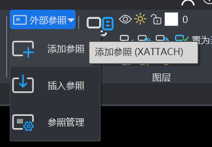 方式一:在功能区的"插入"模块中点击"外部参照"弹出菜单,在菜单中选择"插入参照"。