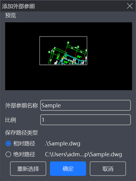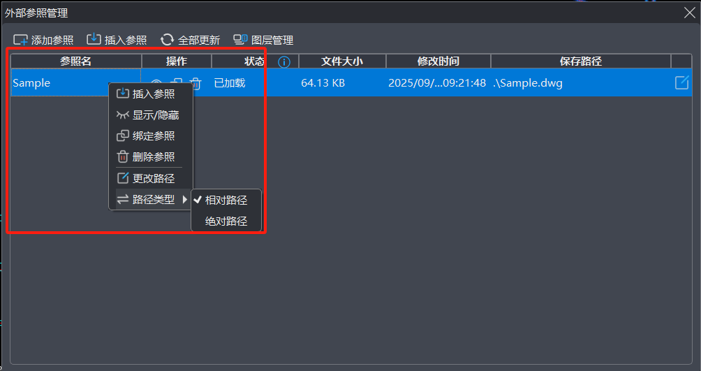 (9)路径类型:在右键菜单中将光标悬停于“路径类型”上,可在弹出的菜单中切换路径的保存模式。选择“相对路径”时仅保存相对于当前主图纸文件的路径;选择“绝对路径”时保存参照文件的完整磁盘位置。