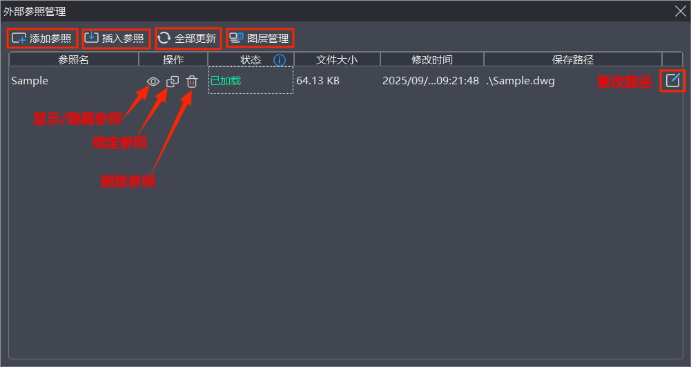 "外部参照管理器"是集中管理当前图中所有外部参照的工具。可以在管理器中清晰地查看每个参照的状态,并执行隐藏/显示、绑定和删除等操作,确保对外部参照文件进行有效控制。