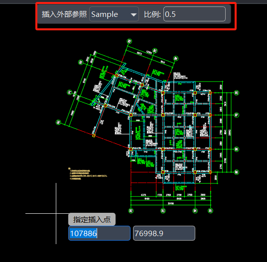 1.执行命令后,顶部中间弹出工具条,如图9-5所示。您可以点击“插入外部参照”旁的小三角,在下拉菜单中切换已添加的参照;或在“比例”输入框中填入所需的缩放比例值改变参照大小。