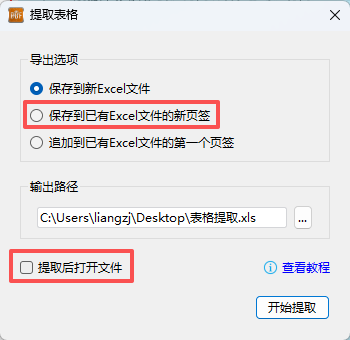 如需将多个表格汇总到一个Excel中,请选择 “保存到已有Excel文件的新页签”。