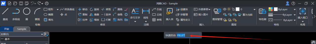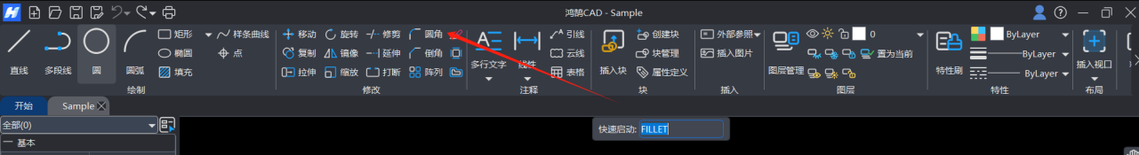 方式二:顶部中间“快速启动”命令区输入“FILLET”或者“F”或者“圆角”,如图4-57所示。