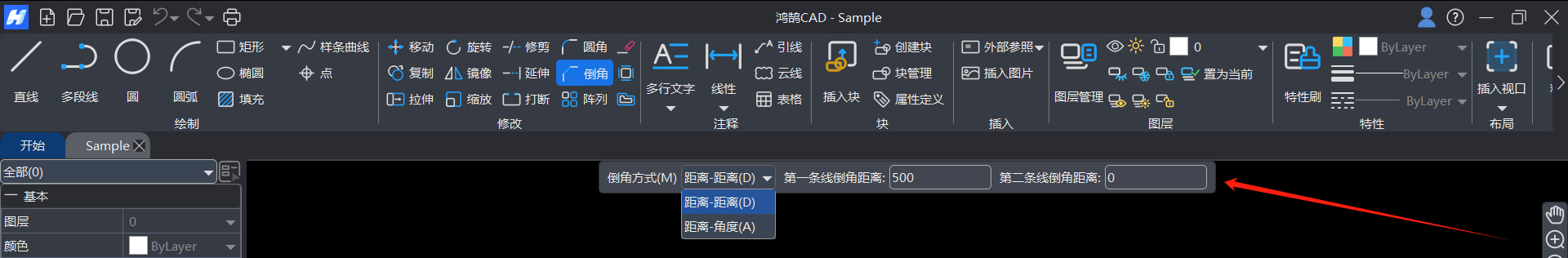 3.设置倒角参数:若选择“距离-距离”模式,则在“第一条线倒角距离”和“第二条线倒角距离”的输入框中,分别填入所需的数值;如果选择“距离-角度”模式,则分别填入“倒角长度”和“倒角角度”的数值。
