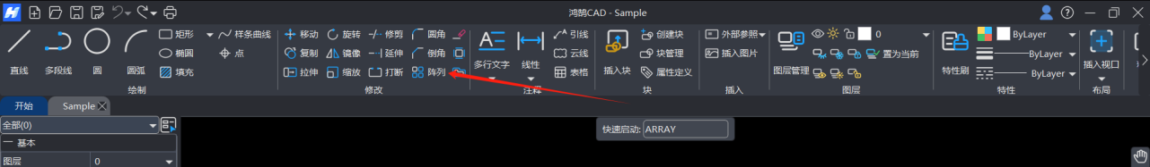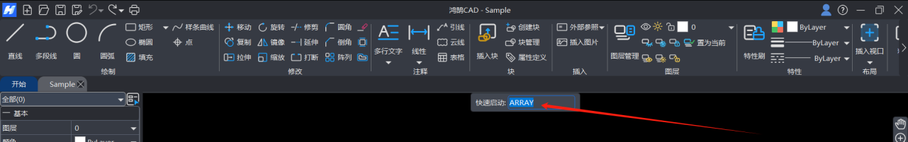 方式二:顶部中间“快速启动”命令区输入“ARRAY”或者“AR”或者“阵列”,如图4-65所示。