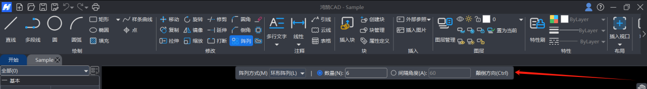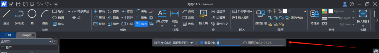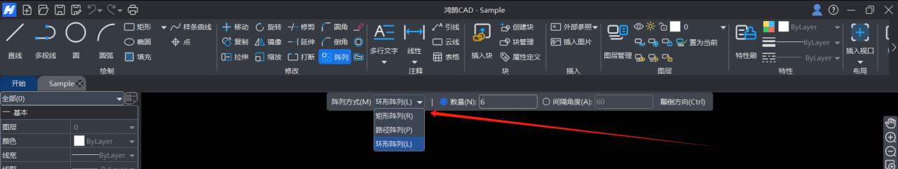 2.系统会在顶部中间的命令行中提供阵列模式选择。点击“阵列方式”的下拉菜单,根据需要选择阵列模式。如图4-66所示。鸿鹄CAD提供矩形阵列、路径阵列和环形阵列三种模式。