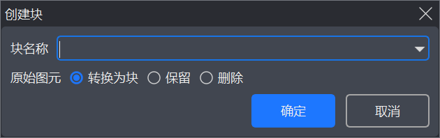 3.完成基准点的指定后,系统会弹出“创建块”对话框,如图6-1所示。在对话框中输入块名称,并根据需要选择对原始图元的操作:是转换为块还是保留或删除。最后点击确认即可完成图块的创建。