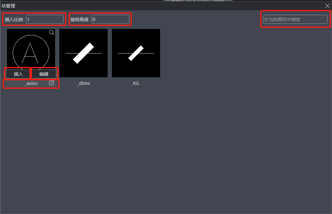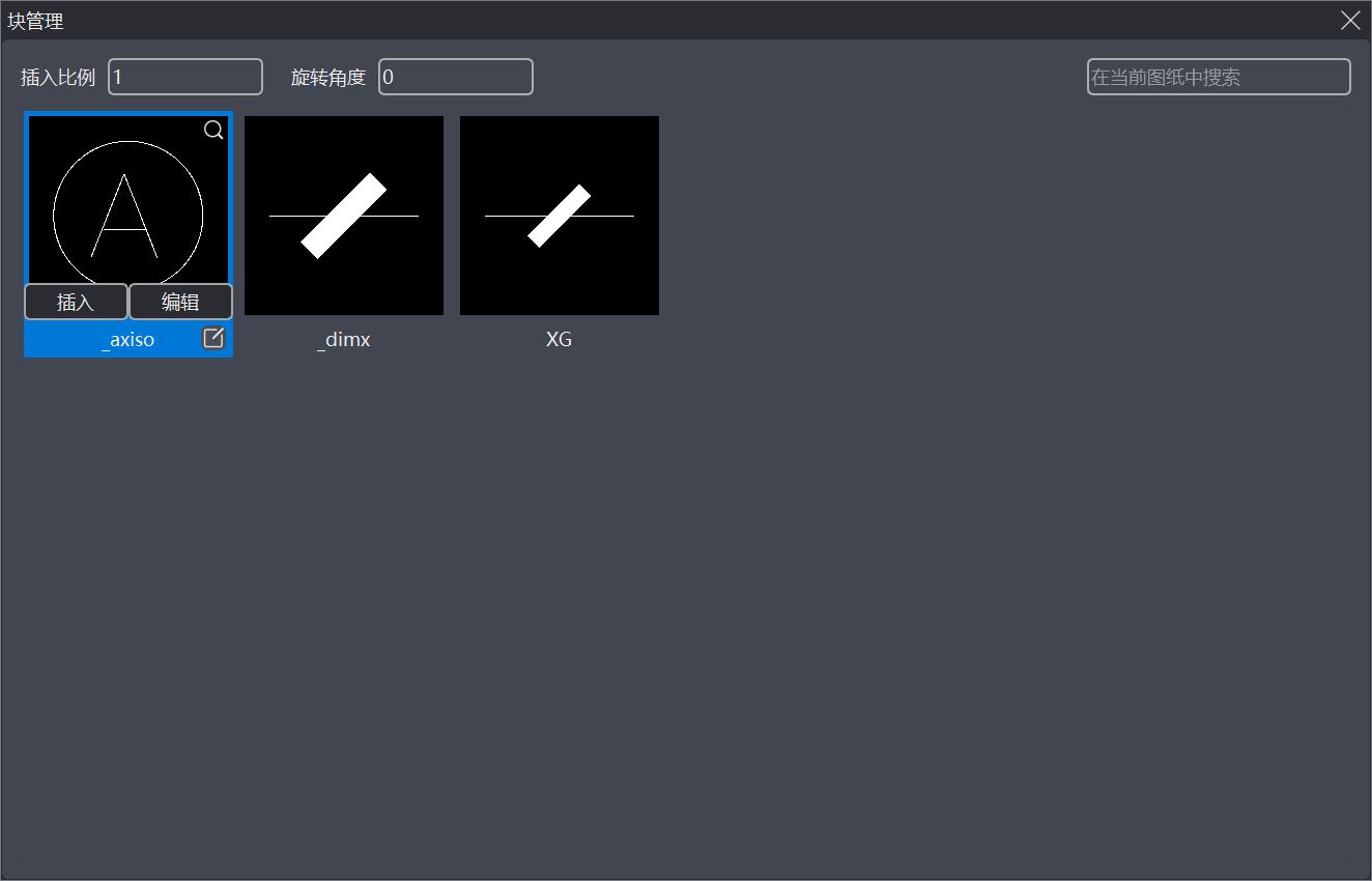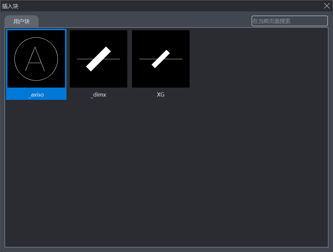 (5)搜索:在对话框右上角的“在当前图纸中搜索”框内输入关键词,可以快速筛选和定位所需的图块。