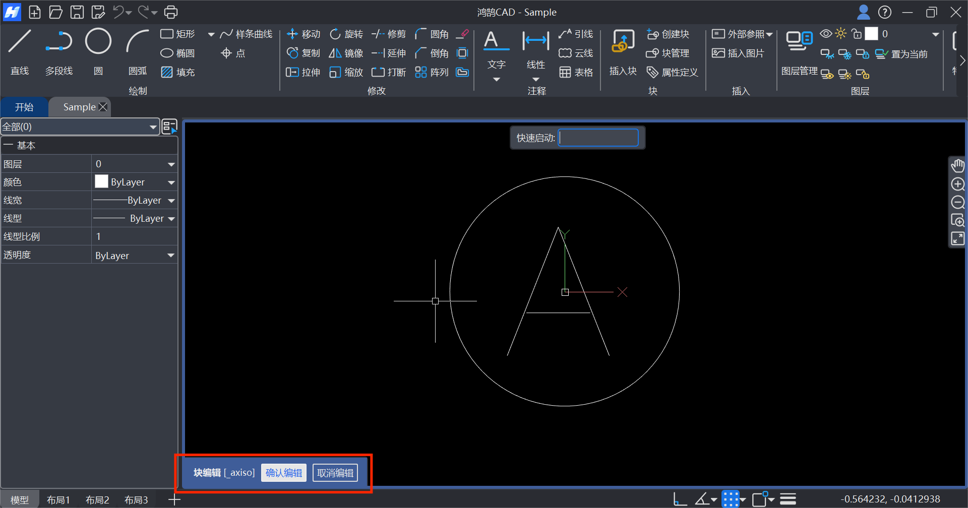 2.在“块编辑”界面可以像在常规绘图空间一样,使用各类绘图和修改命令来编辑图块。编辑完成后,点击底部块编辑工具栏中的“确认编辑”按钮,若不希望保存所作出的修改,则点击“取消编辑”按钮。