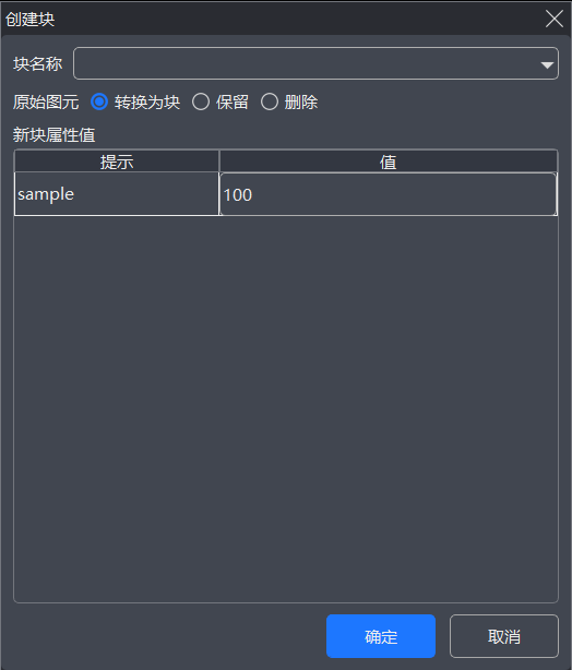 2.在弹出的对话框中输入块名称,并根据需要选择对原始图元的操作是转换为块还是保留或删除。在“新块属性值”表格中,系统会列出所有被选中的“属性定义”。您可以直接在“值”一栏为属性块设置属性值。最后点击确定即可完成属性块的创建。