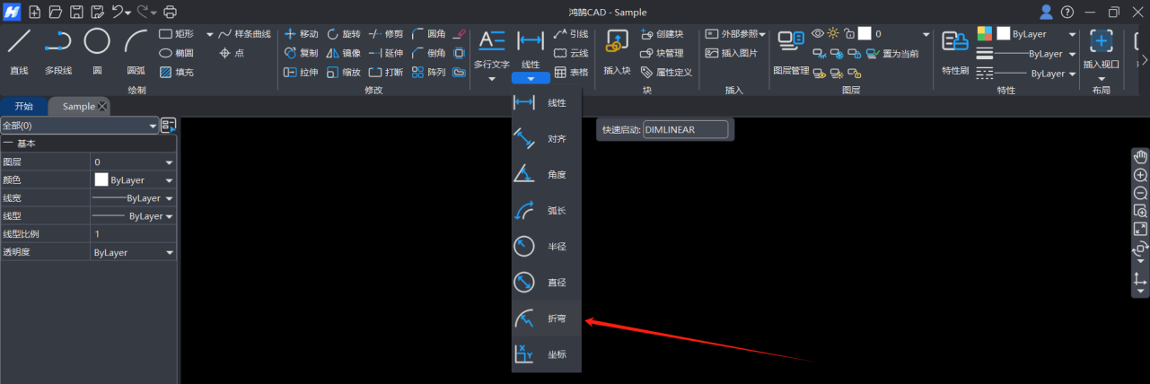 2.在顶部中间的动态输入框中选择标注样式,“折弯”可选的标注样式与“半径”和“直径”相同;