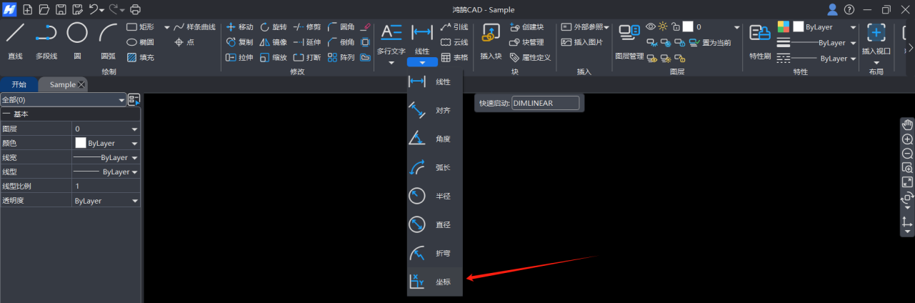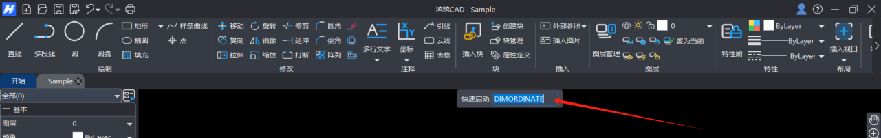 方式二:顶部中间“快速启动”命令区输入“DIMORDINATE”或者“坐标”,如图7-27所示。