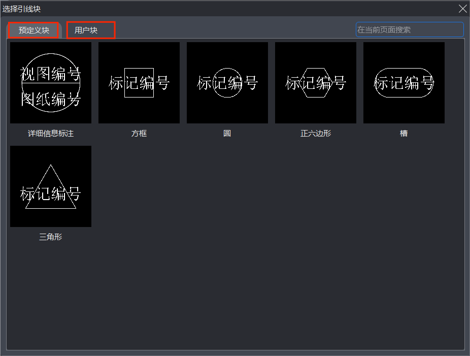 4. 系统弹出“选择引线块”对话框,如图7-33所示。“预定义块”选项卡提供系统内置的常用符号,“用户块”选项卡则显示当前图纸中所有自定义的图块。在框内选择需要插入的“块”,点击鼠标左键确认。