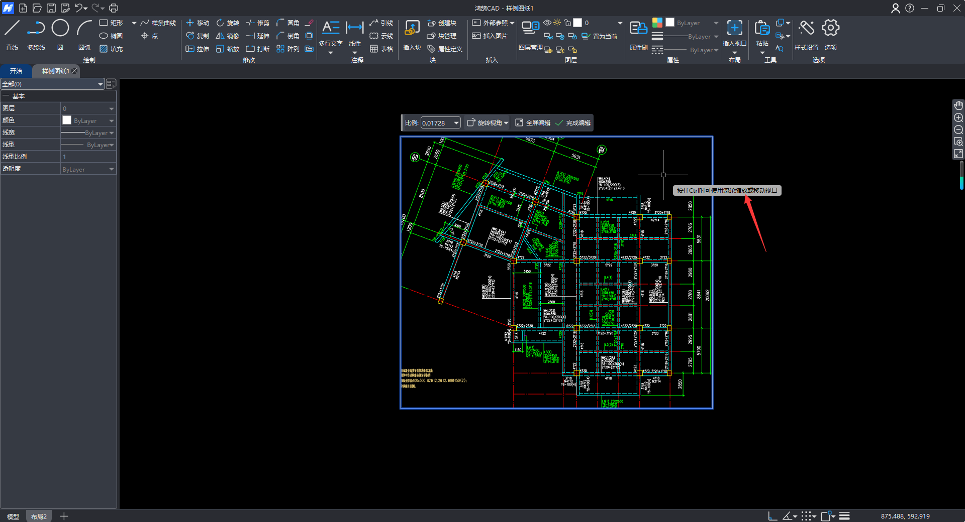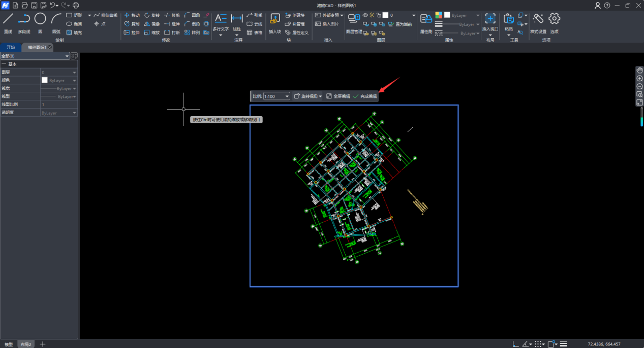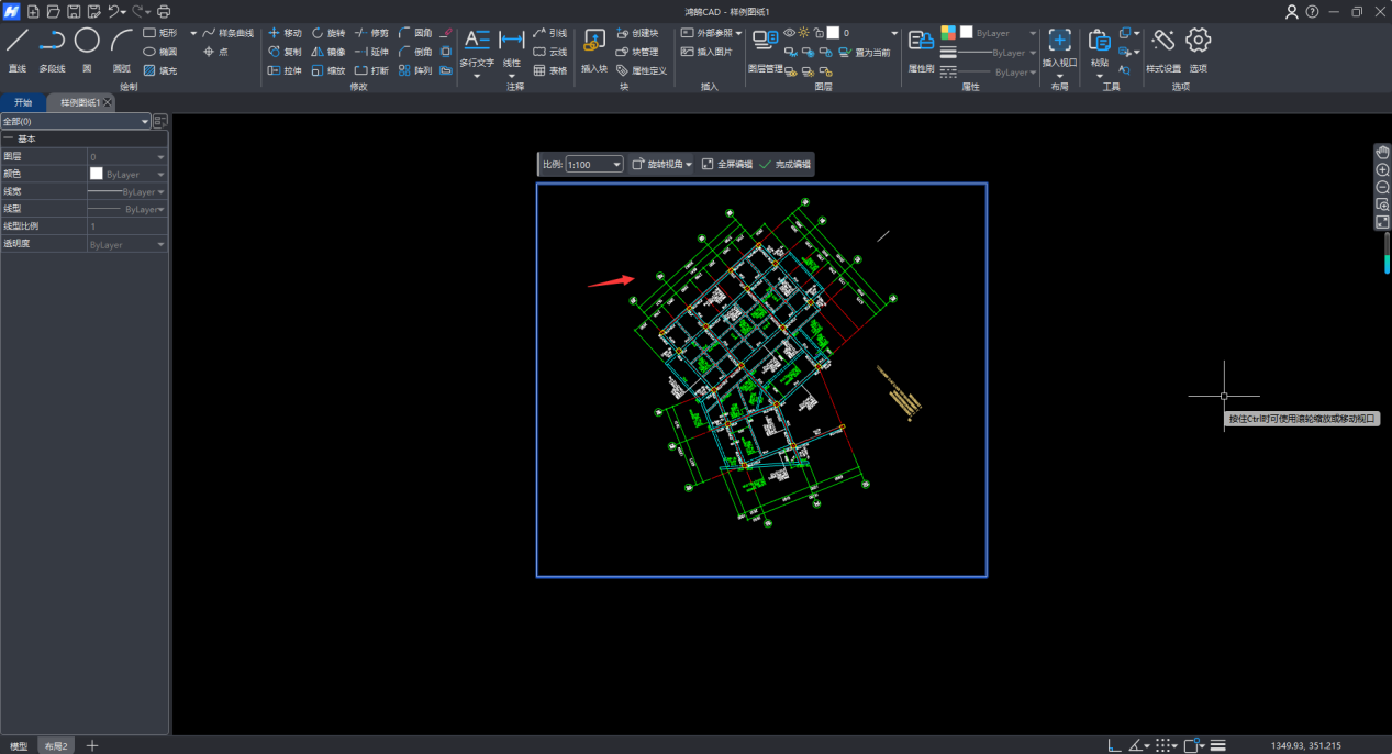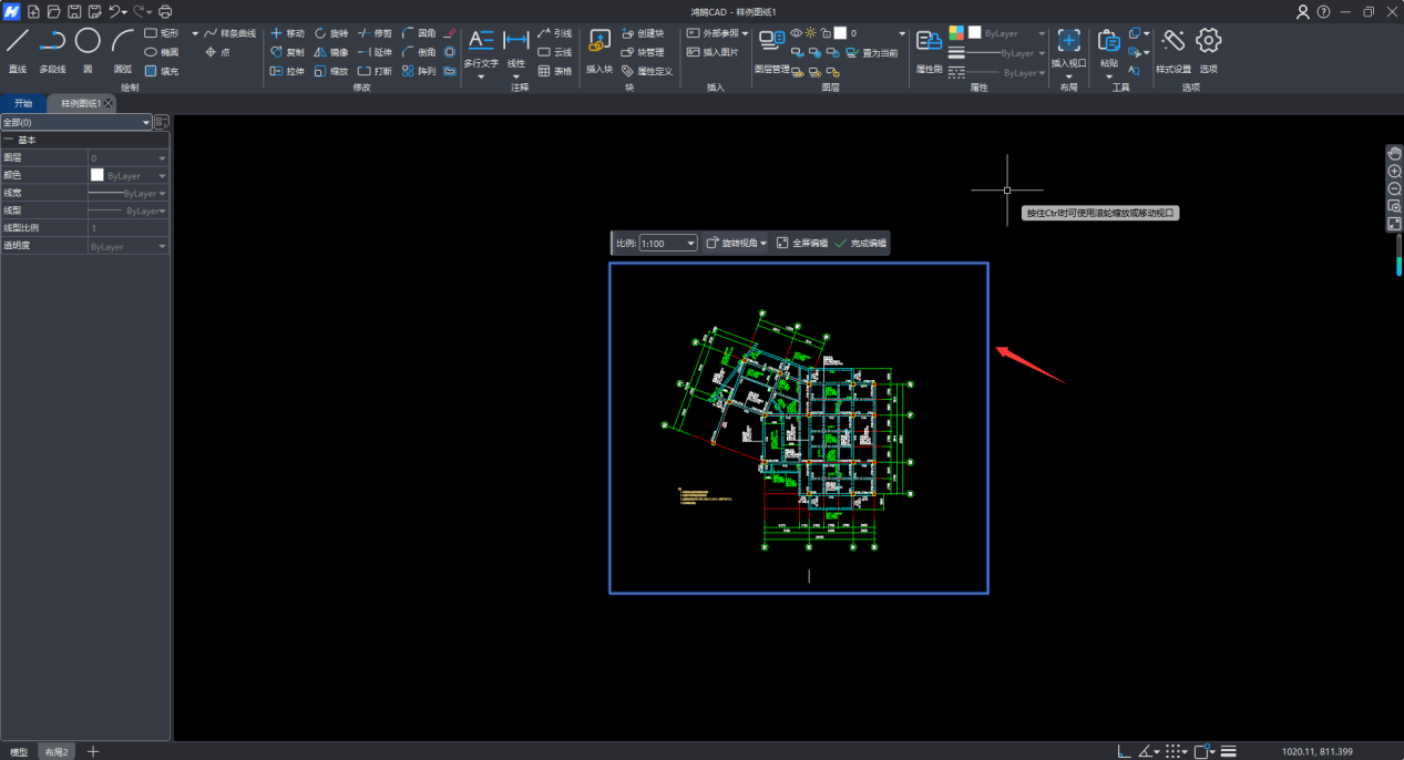在鸿鹄CAD中,此命令用于调整视口的属性。您可以快速调整视口的比例、移动、旋转和缩放视口,也可以全屏编辑视口。