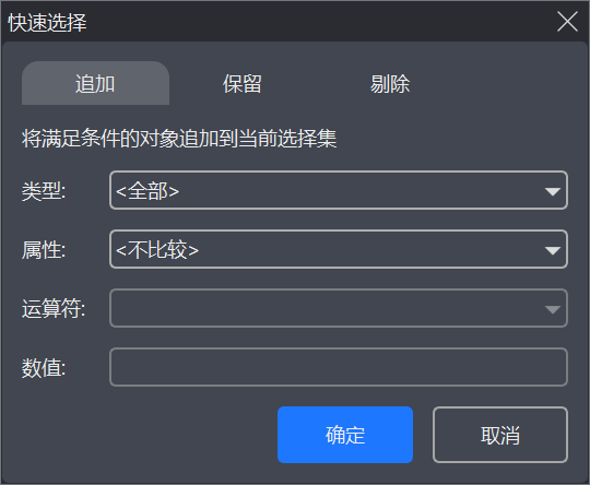1.执行命令后,会弹出"快速选择"对话框,如图10-4所示。您可以在对话框中设置筛选条件,来对当前选中的对象进行"追加"、"保留"、"剔除"的操作,快速过滤出您真正需要操作的对象。