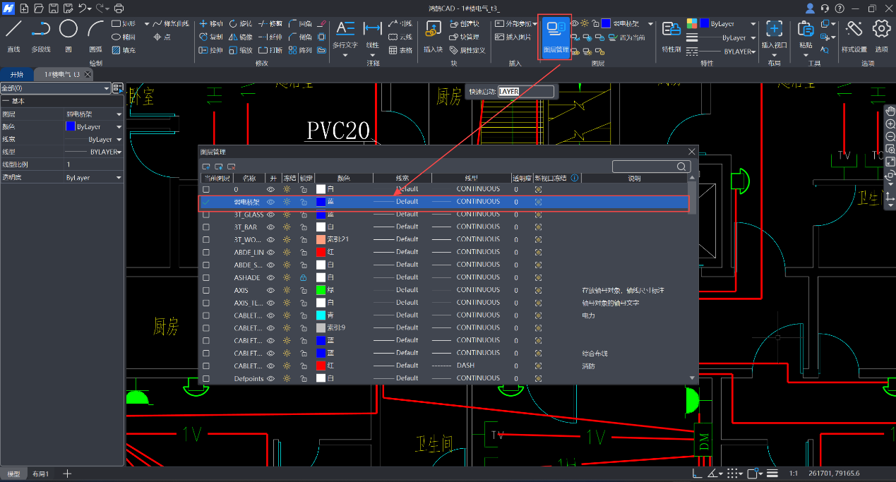 为清晰区分不同图层,点击【图层管理】功能新建“弱电桥架”图层:颜色设为蓝色,线宽保持Default,线型选择“CONTINUOUS”。