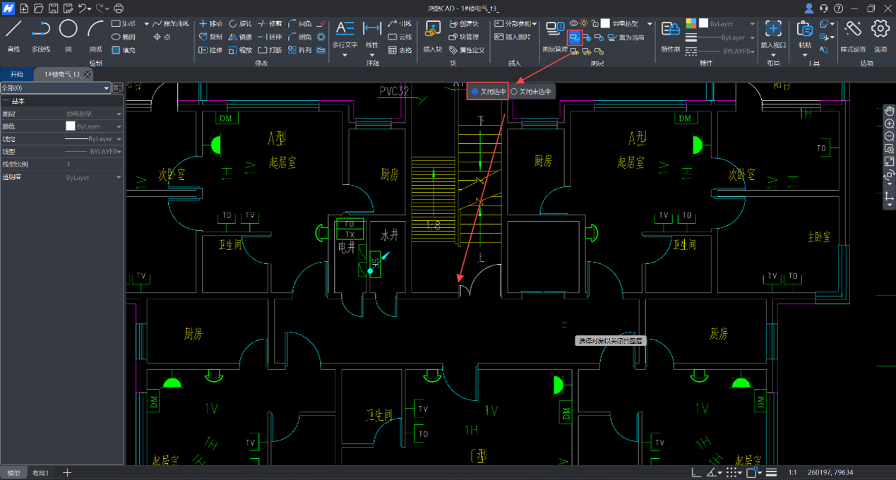 鸿鹄CAD还提供了“关闭未选中图层”选项,适合想要保留少部分图纸内容的情况(想关闭的内容更多),这样只需少量选中想要保留的指定内容,就能一键关闭无关内容,使图纸更加清爽直观。