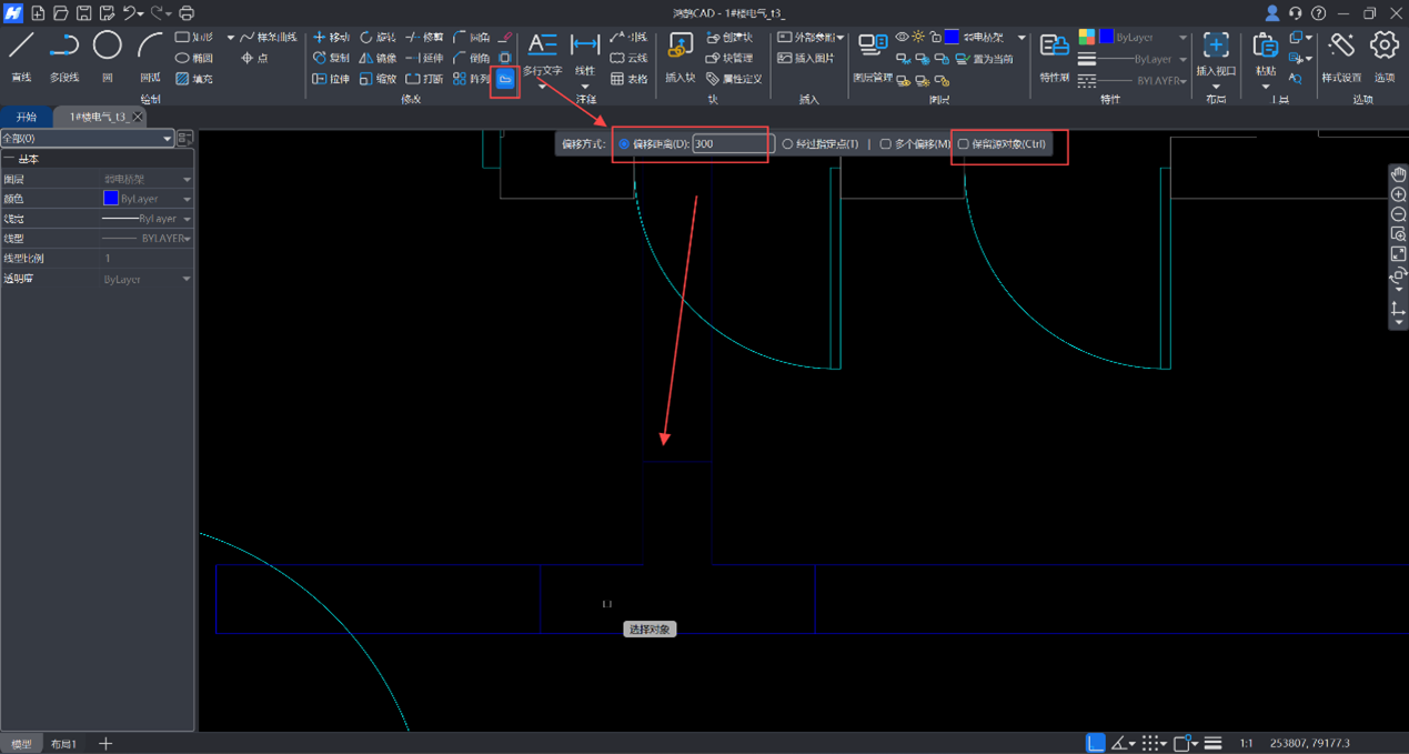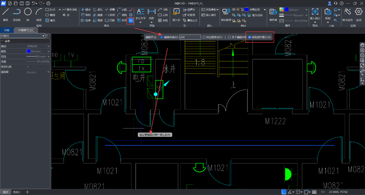 执行【O】偏移命令处理线段:平面图中桥架绘制宽度通常不等于实际工程宽度(实际宽度将通过文字标注说明),因此线段偏移距离设为200mm,操作时需勾选“保留源对象”。