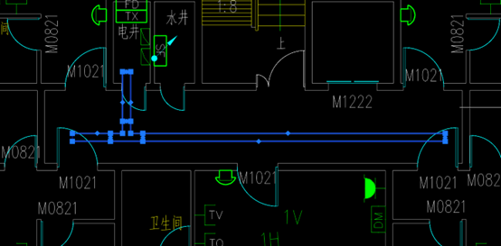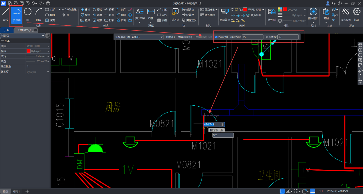 接着框选需调整路径的管线,用【E】删除命令或Del快捷键删除,再用【PL】多段线命令重新绘制(线宽35,35),起点为器具图形边缘,终点为弱电桥架边缘。