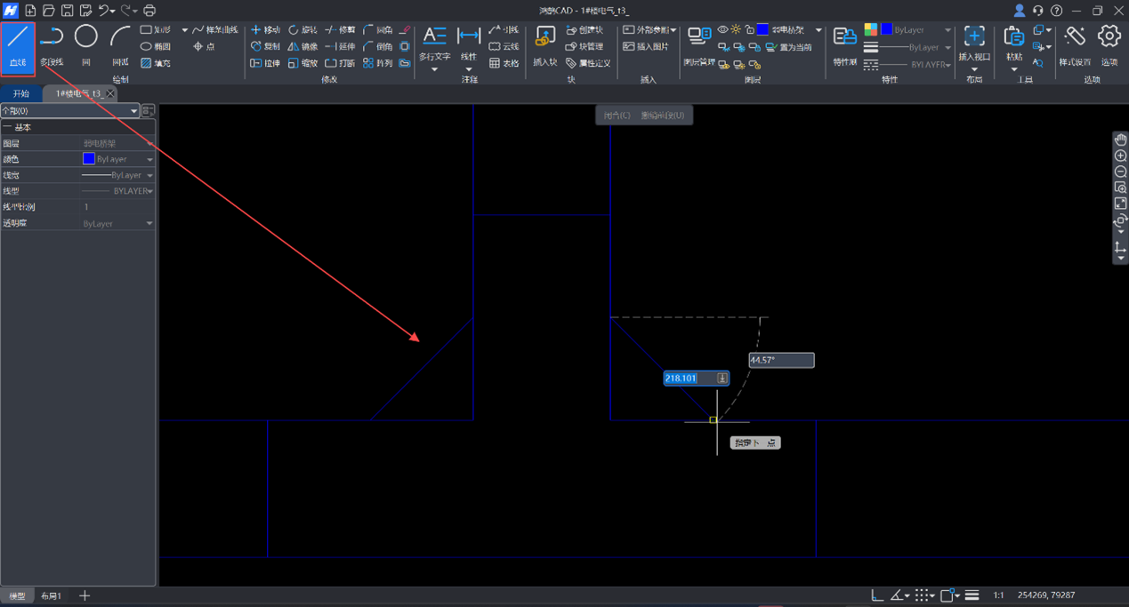 使用【L】直线命令绘制桥架主体位置:每层桥架从竖井引出,沿走廊吊顶下方、梁下等区域水平敷设。绘制时开启【F8】正交模式辅助操作,可大幅提升效率。