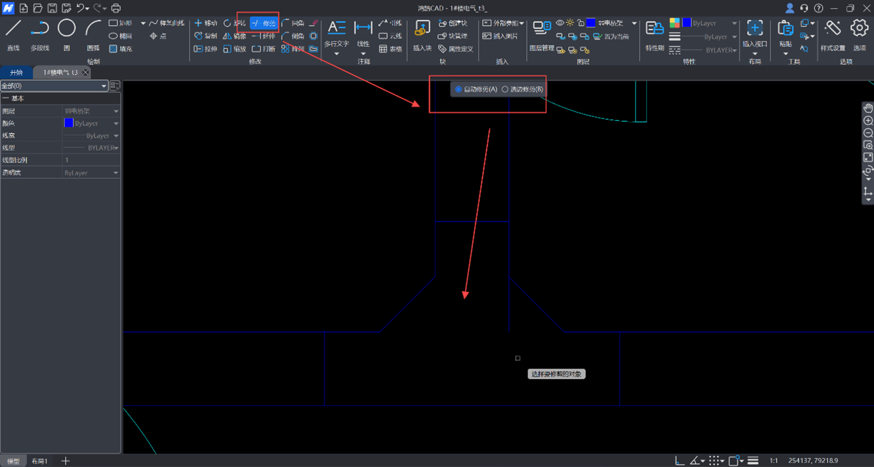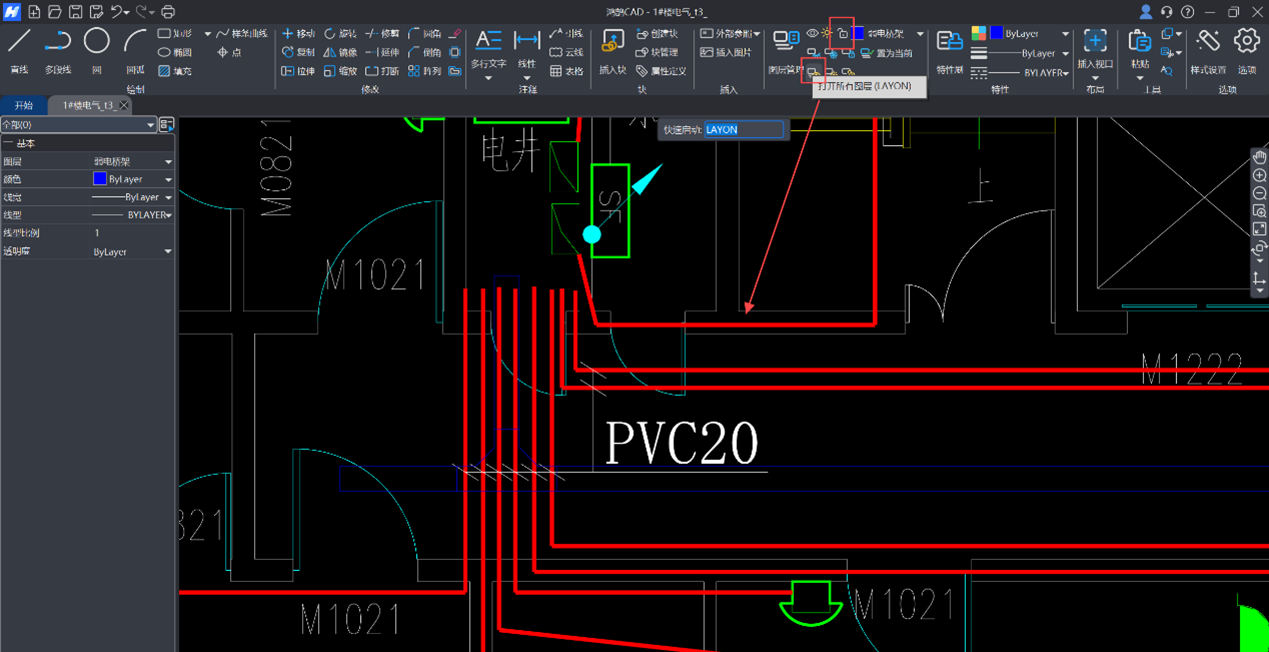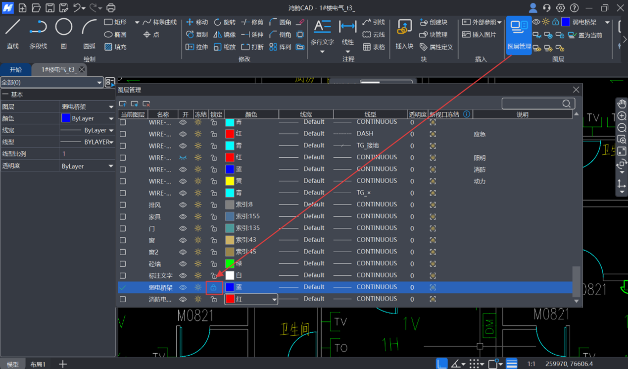 首先执行【LAYON】命令打开所有图层,并点击“弱电桥架”图层的小锁将该图层锁定(避免修改管线时误删桥架);