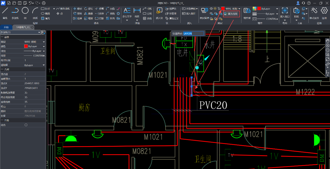 再在右上角快速切换图层到管线所在的“WLRE-照明”图层,并通过图层【置为当前】功能设为当前图层;