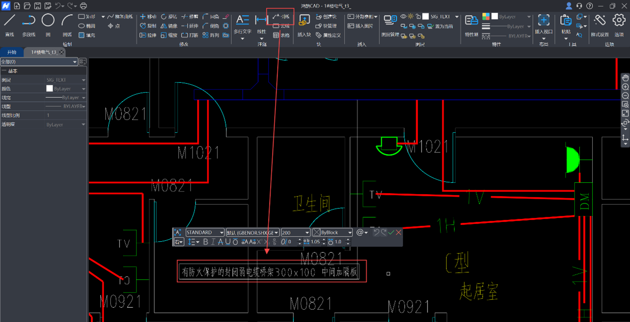 使用注释模块的【引线】功能,从桥架向空白区域引出标注,注明规格、材质及安装方式,例如:“带防火保护的封闭弱电电缆桥架300mm×100mm,中间加隔板”。