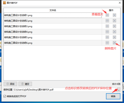 点击“转换”按钮后,会将添加的图片合并转为一个PDF,如果需要单独的PDF,需要逐个转换。