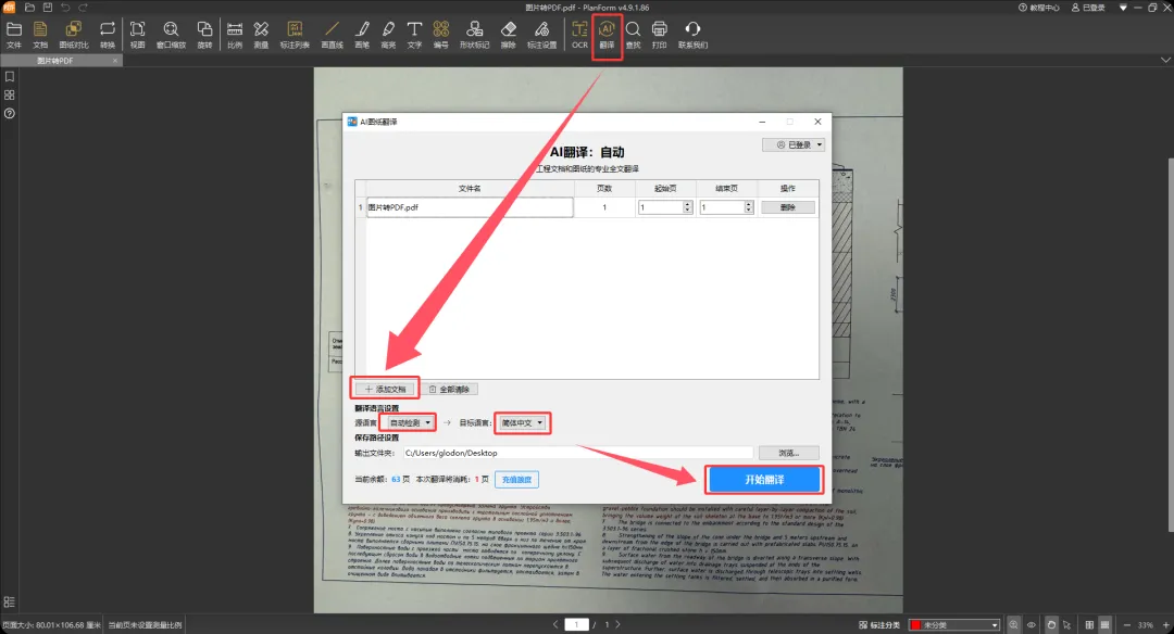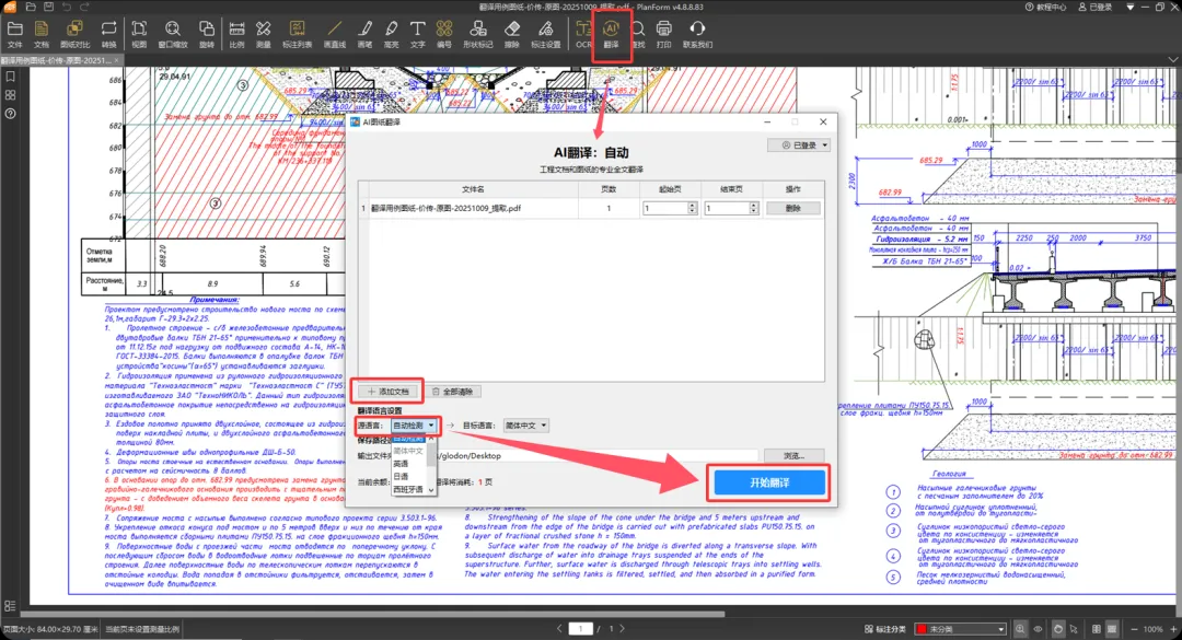 PlanForm-AI支持PDF直接翻译,CAD图纸翻译需先转换格式: