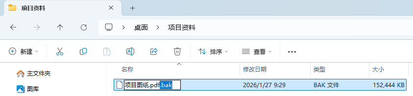6、选中该bak备份文件进行重命名,删除最后的「.bak」4个字符
