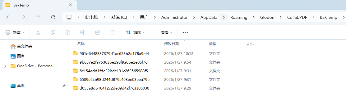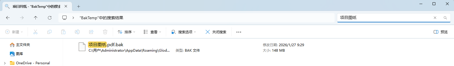 - 存放bak备份文件的程序数据储存路径一般默认为隐藏文件夹,如果想直接通过文件夹找到,需要先在Windows资源管理器中显示“隐藏的项目”,在通过以下文件路径逐层打开:C:\Users\【当前电脑用户名】\AppData\Roaming\Glodon\CollabPDF\BakTemp
