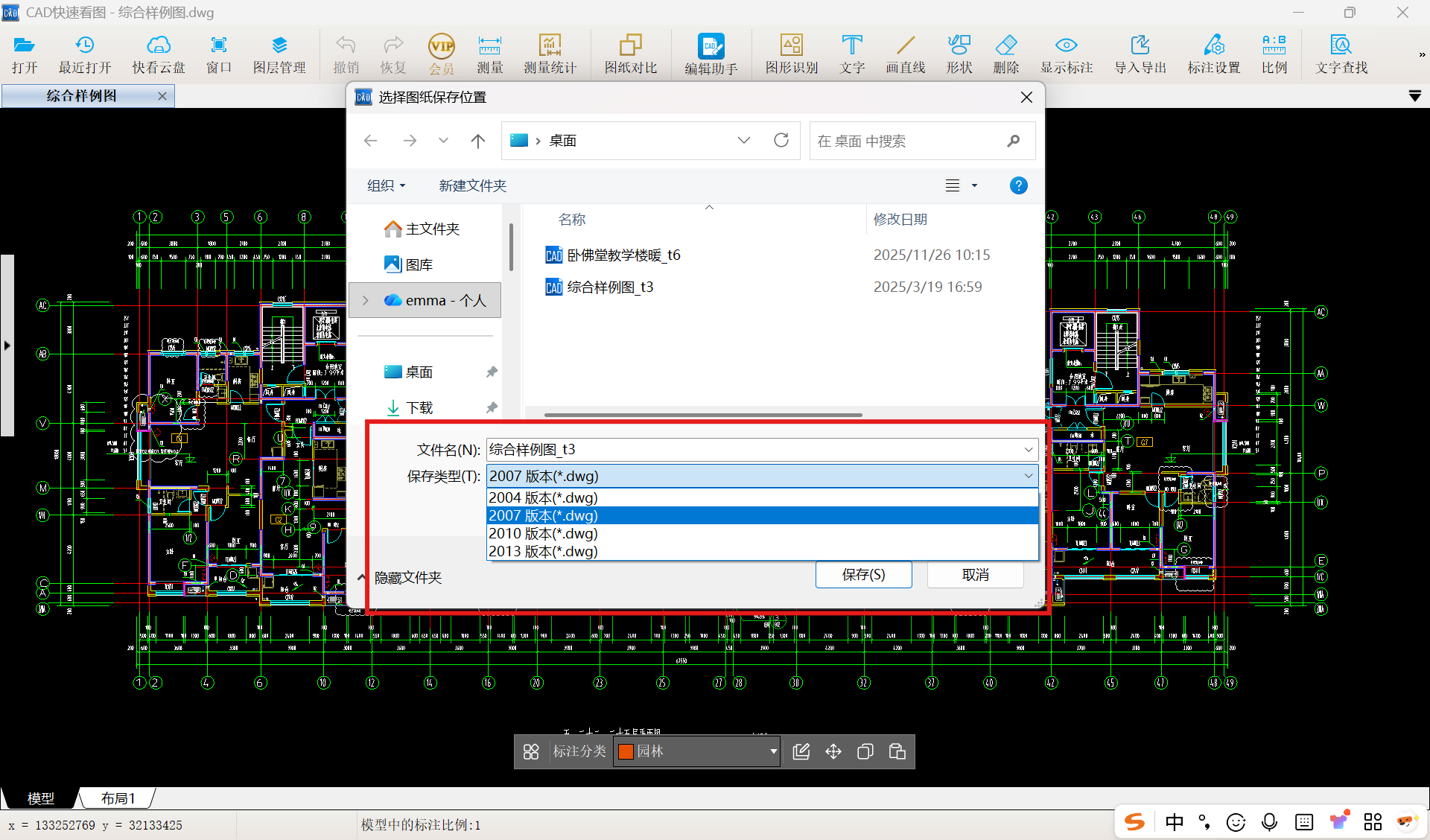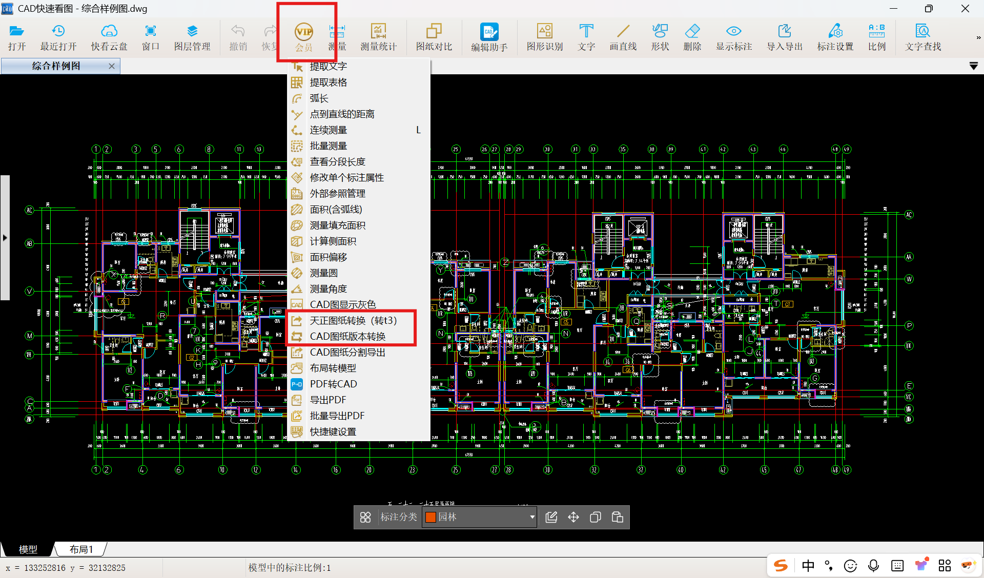 软件还有转t3、图纸版本转换功能,一键转换高版本天正/CAD图纸到低版本,让你的其他软件(低版本AutoCAD、低版本天正、其他计量/编辑软件)也能完整显示图纸内容了。