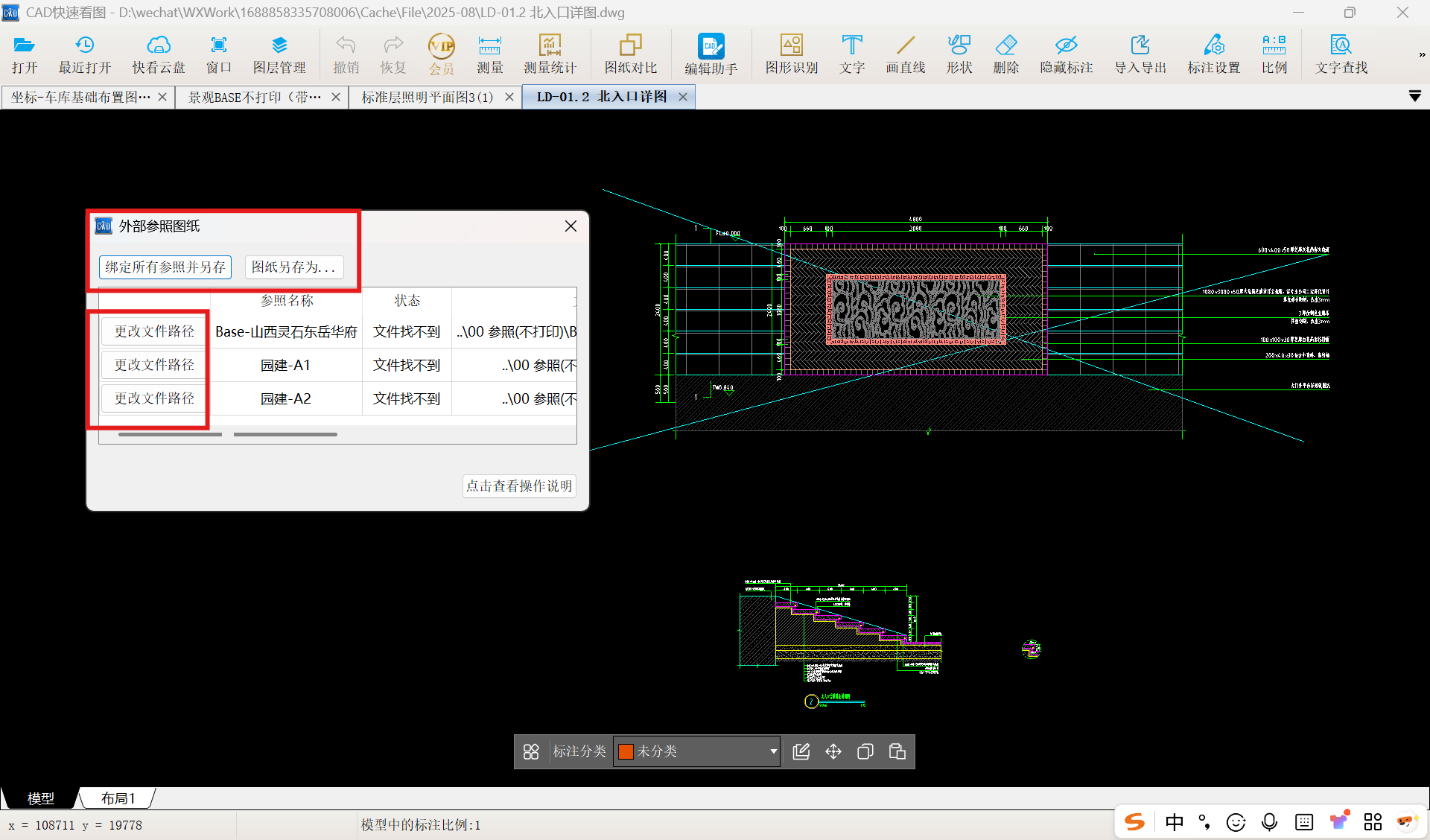 场景:打开建筑专业提供的平面图,墙体、门窗都不见了,只剩下轴线。大多是图纸使用了外部参照(如将楼梯单独存为一个文件),但参照文件未随主图一并发送,或接收后路径改变导致软件找不到。