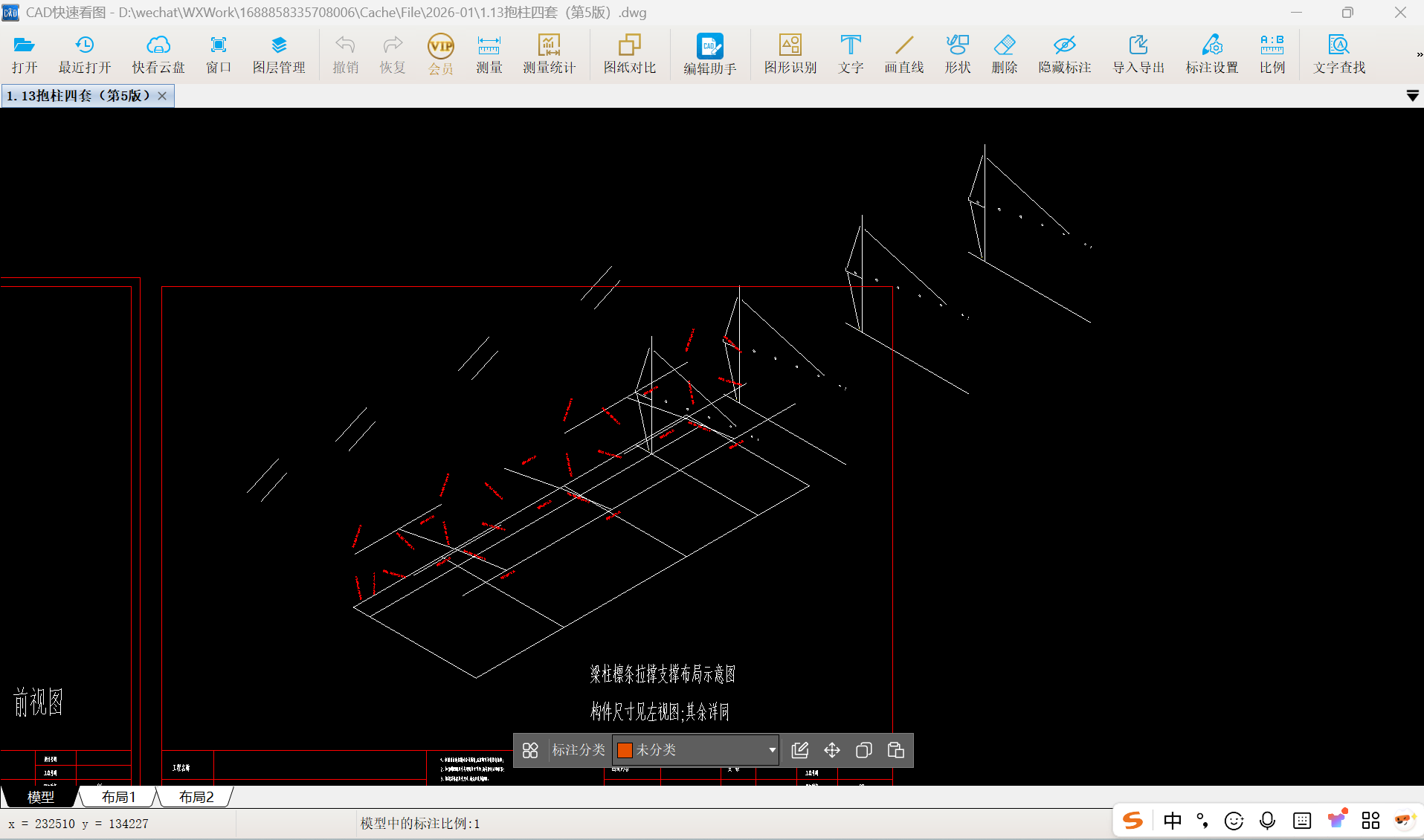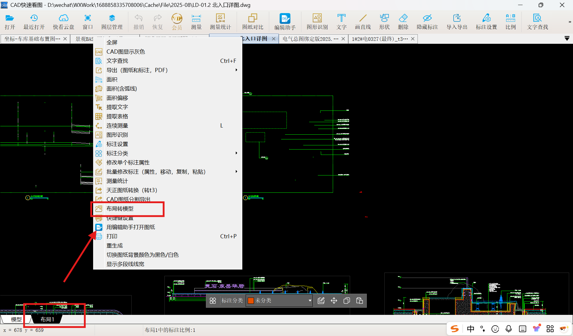 解决方案:在CAD快速看图中,在布局图中,点击鼠标右键,选择 “布局转模型”,将布局内容转换为模型中查看。