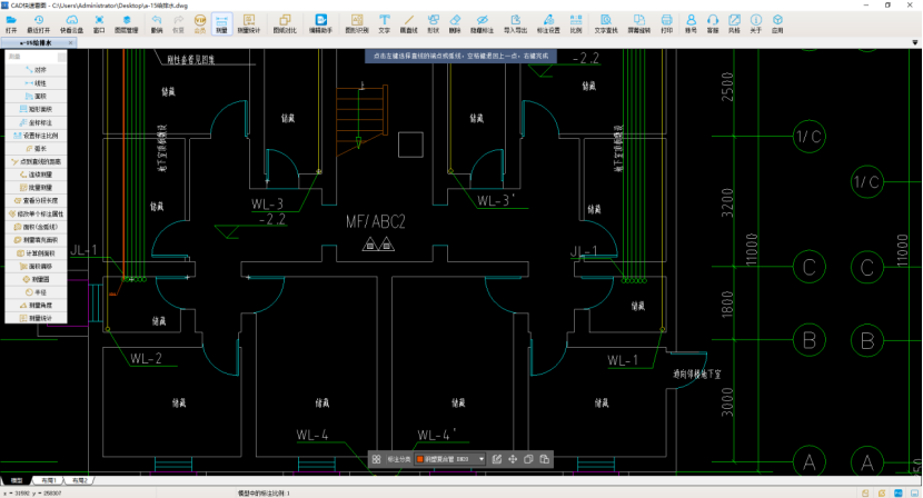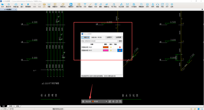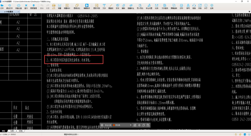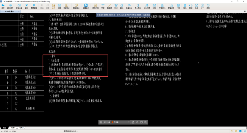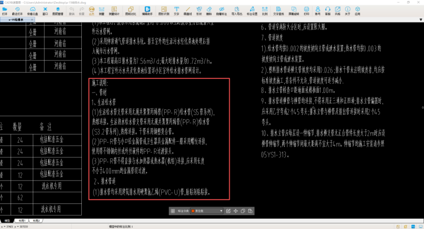 首先,在CAD快速看图中打开图纸,依据设计说明,确定管道材质。干管采用钢塑复合管,支管采用PP-R给水管 S5系列