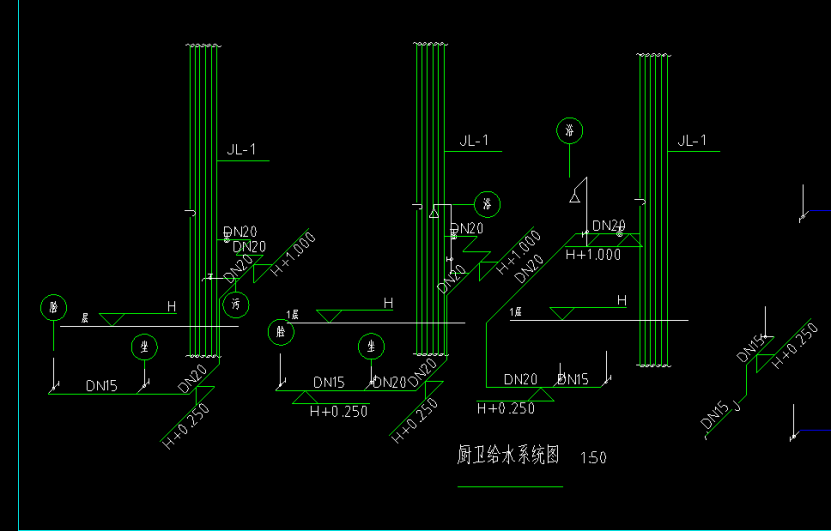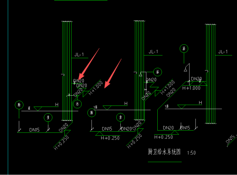 再者,结合厨卫系统图,可以知道管道规格变化点在距离地面1米处。每层+1。
