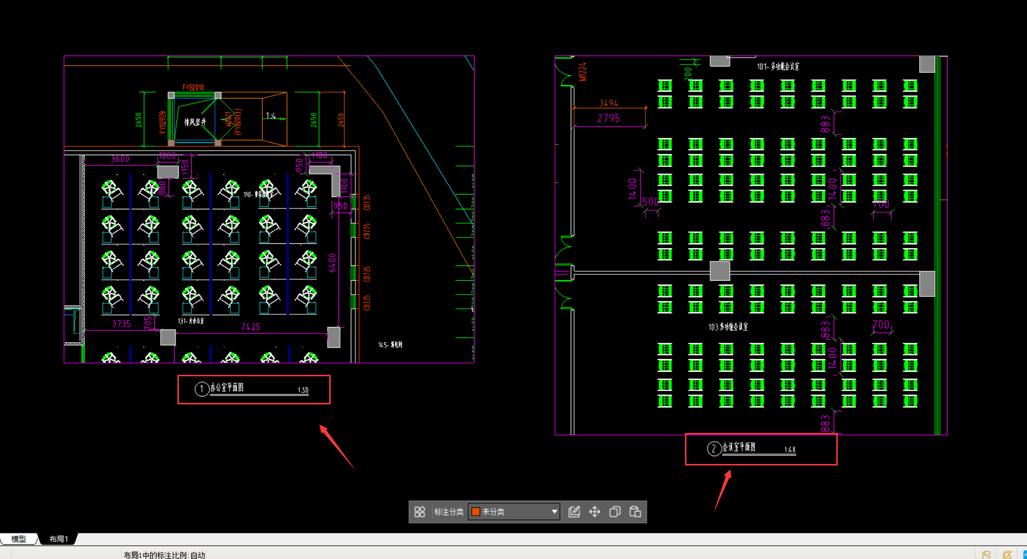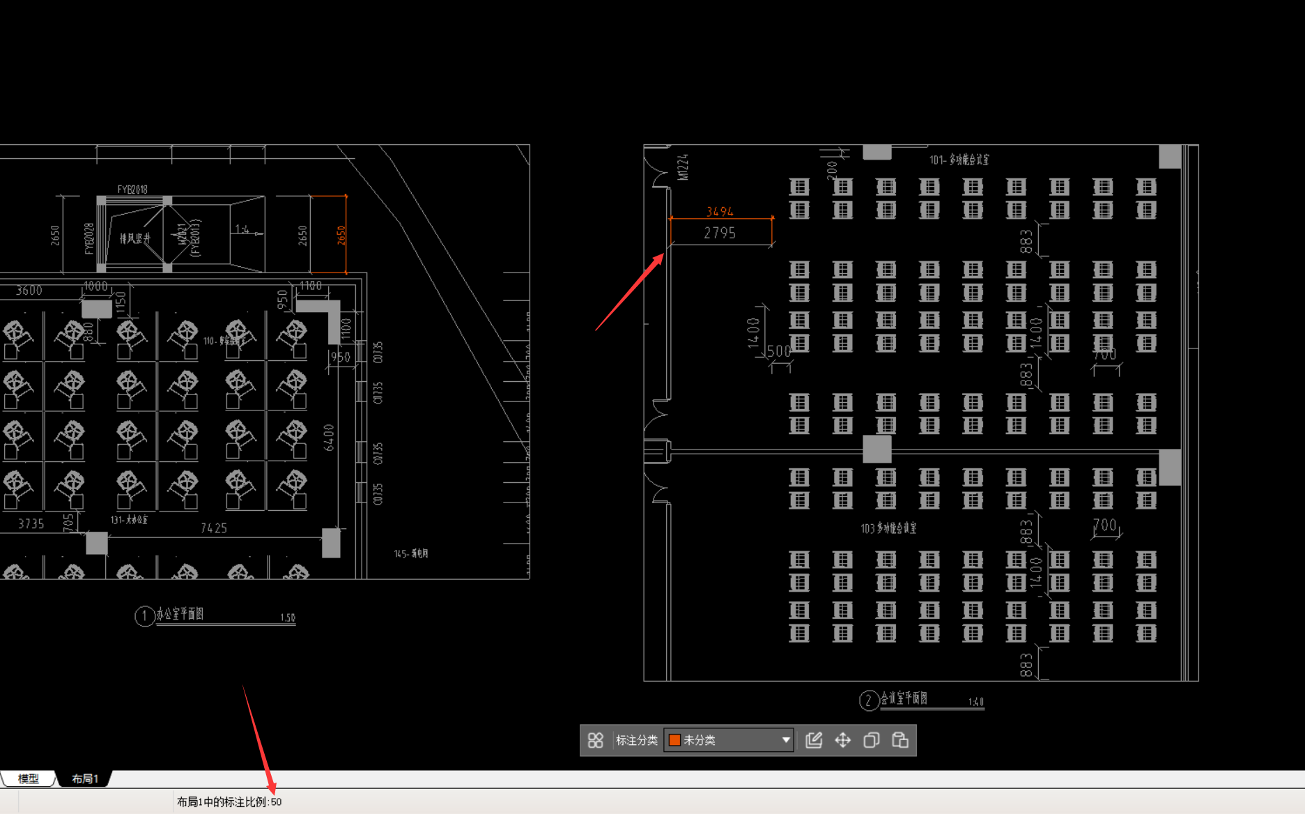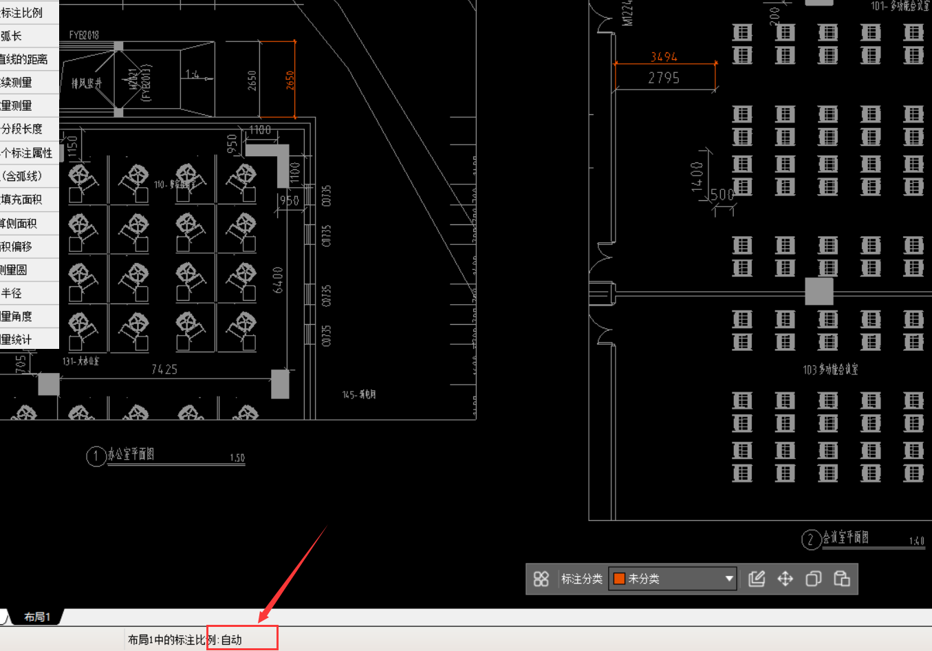 比如先按①办公室平面图的比例调整后,在②会议平面图上测量会发现②的长度不准确。如下图所示。