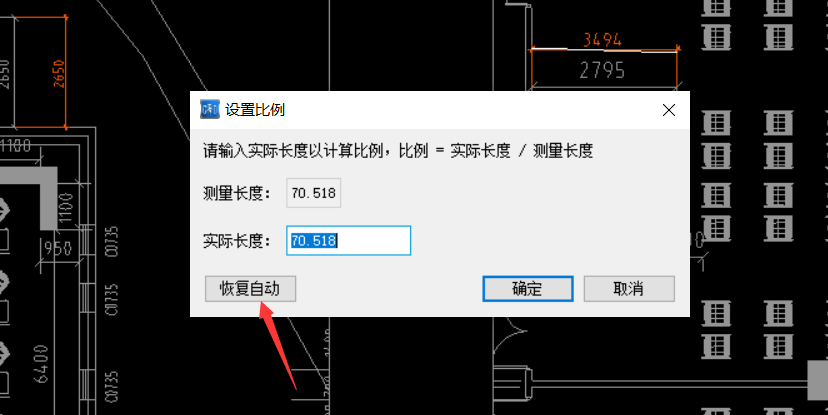 在布局设置比例后,遇到了比例变化的视口,测量结果与图纸标注不一致时,可以通过恢复自动的方式来变为自动。